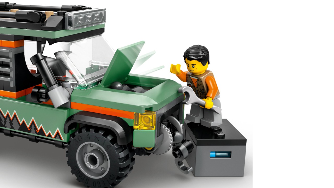 Turn the vehicle snorkel and open the hood to repair the engine! Adds adventurous minifigurine and let the game start.