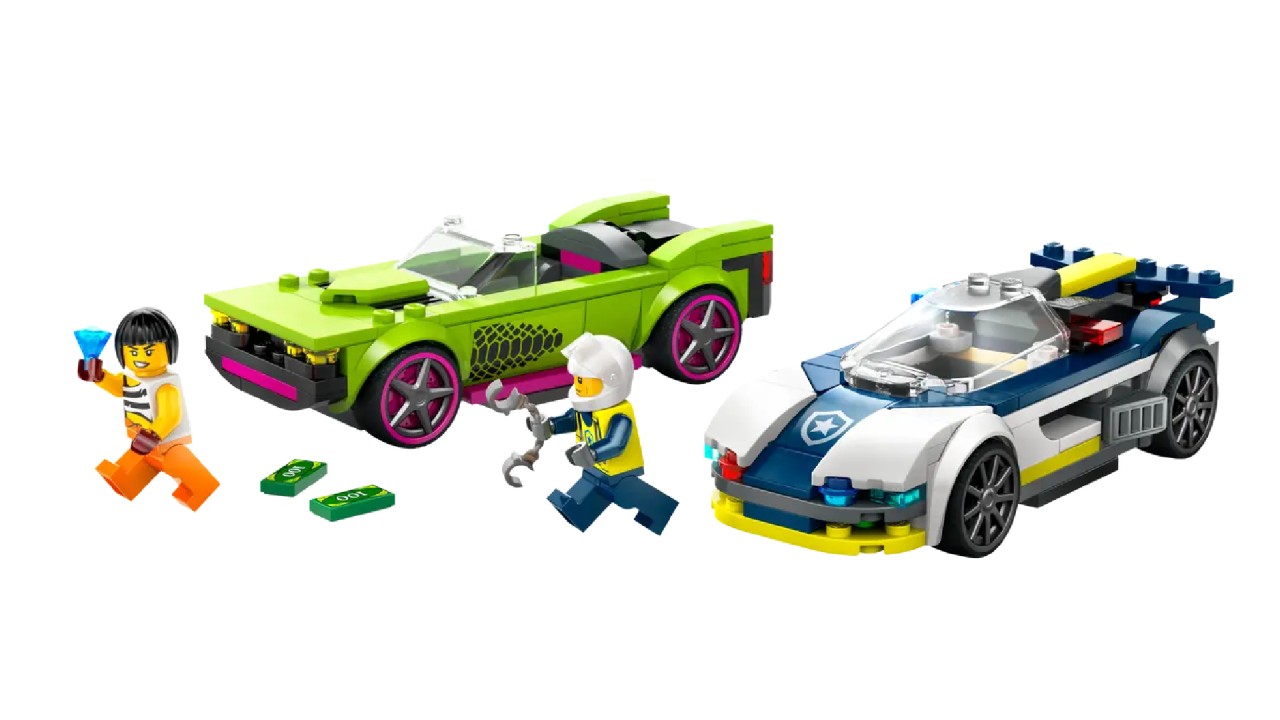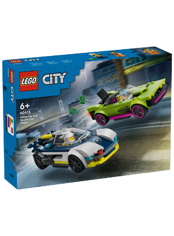 The LEGO City Police Car and Muscle Car Chase set for boys and girls includes a police interceptor and getaway vehicle, plus officer and crook minifigures for role-play and fun storytelling.