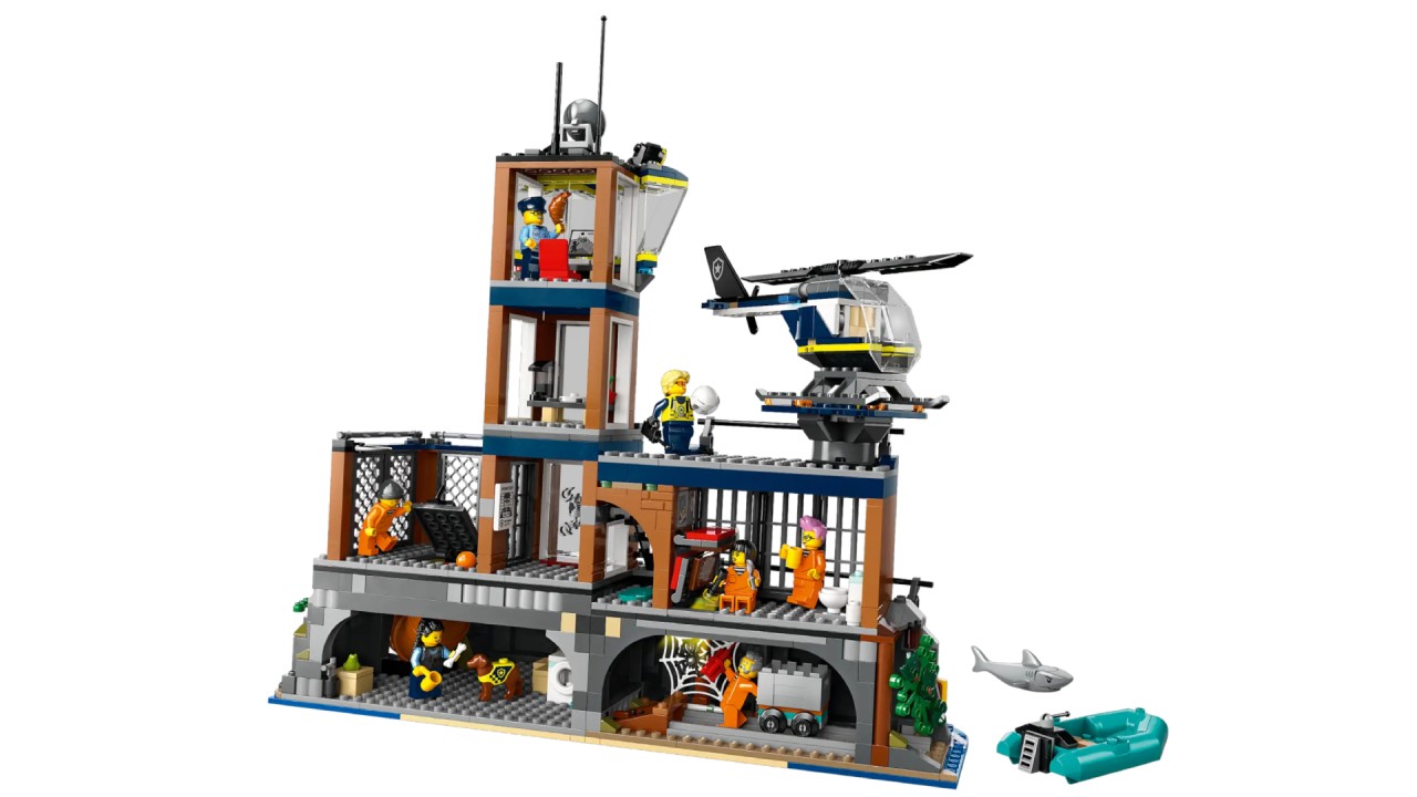 The set includes a toy prison island with a cliff, a prison, a toy police boat, a lifeboat, a toy helicopter, 3 police minifigures and 4 prisoner minifigures, plus a police dog and a shark. toy.