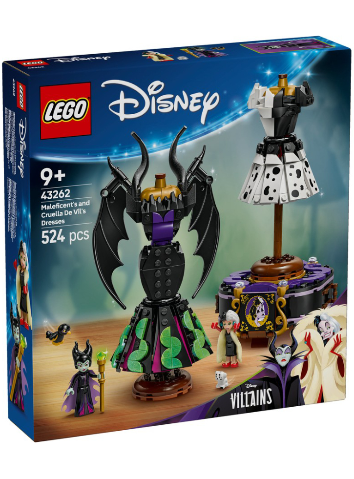 Inspiră creativitatea fanilor Disney de 9 ani și mai mari cu setul de construcție LEGO®ǀ Disney Rochiile lui Maleficent și Cruella De Vil (43262).
