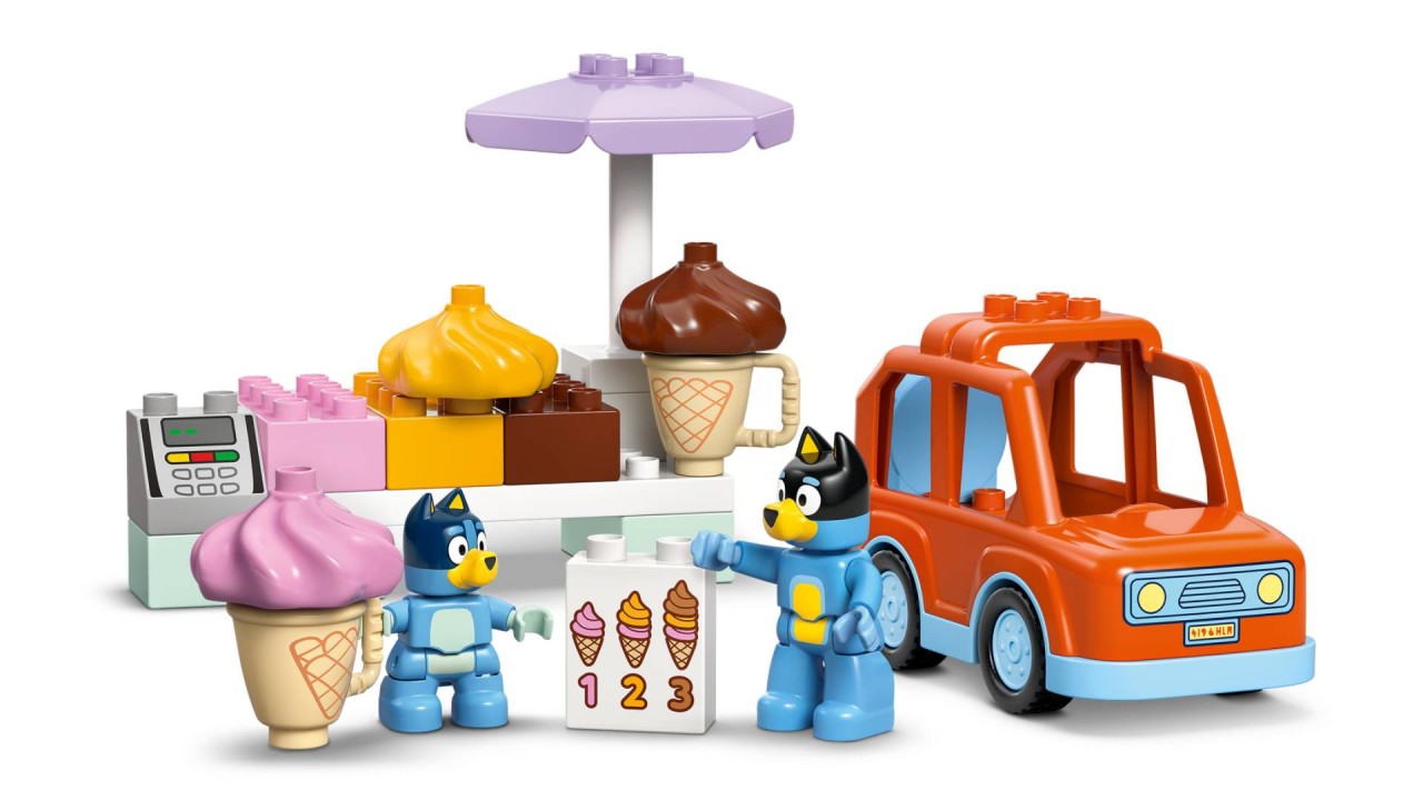 Enter the fun-playing world playing world with the Ice Cream Trip With Bluey children's toys set, they enjoy imaginative games while starting on a LEGO Duplo adventure using this set of vehicles to recreate scenes from the Bluey TV series.