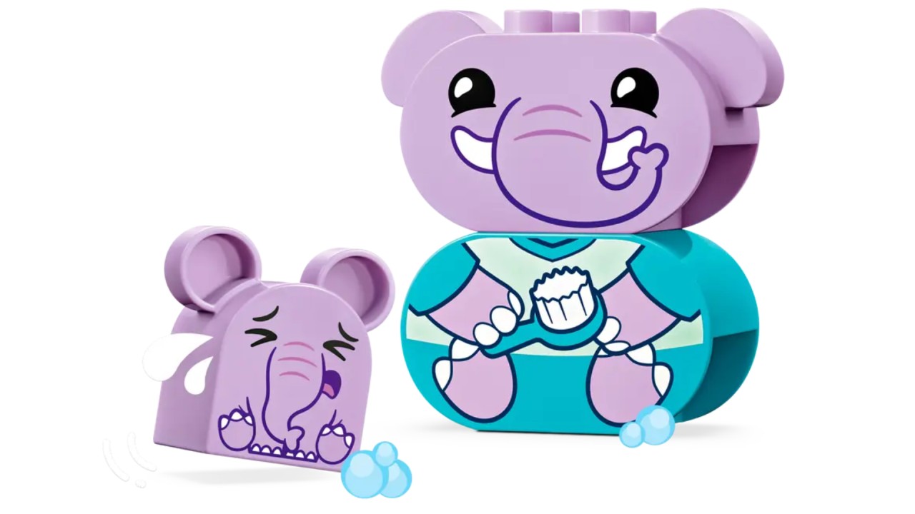 This socio-emotional development toy includes a baby elephant figure wearing a happy or sad expression to help little ones play with their feelings around washing routines.