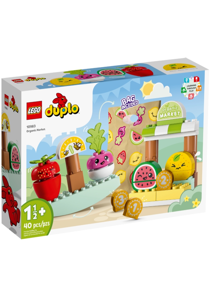 Învățați-i pe cei mici cum să facă cumpărături cu setul LEGO DUPLO Prima mea piață organică. Această piață agricolă distractivă îi ajută pe copii să învețe despre echilibru, stivuind ridichea, căpșuna, lămâia și pepenele verde.