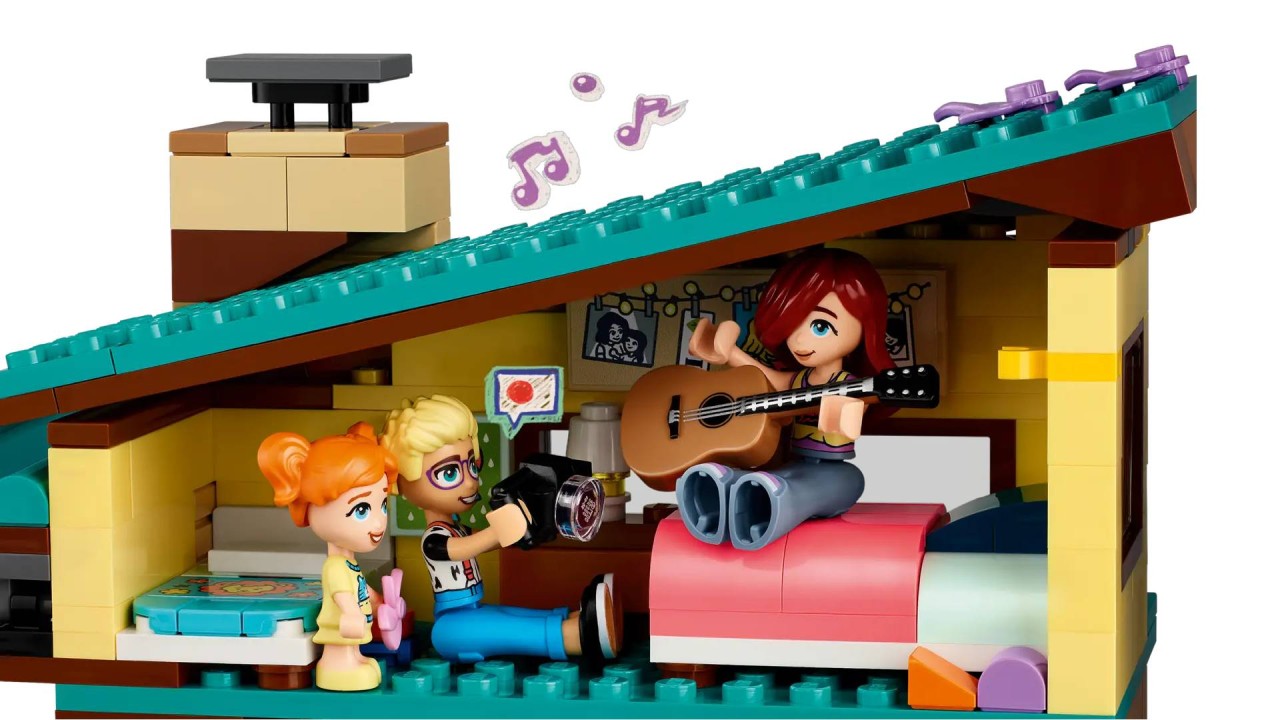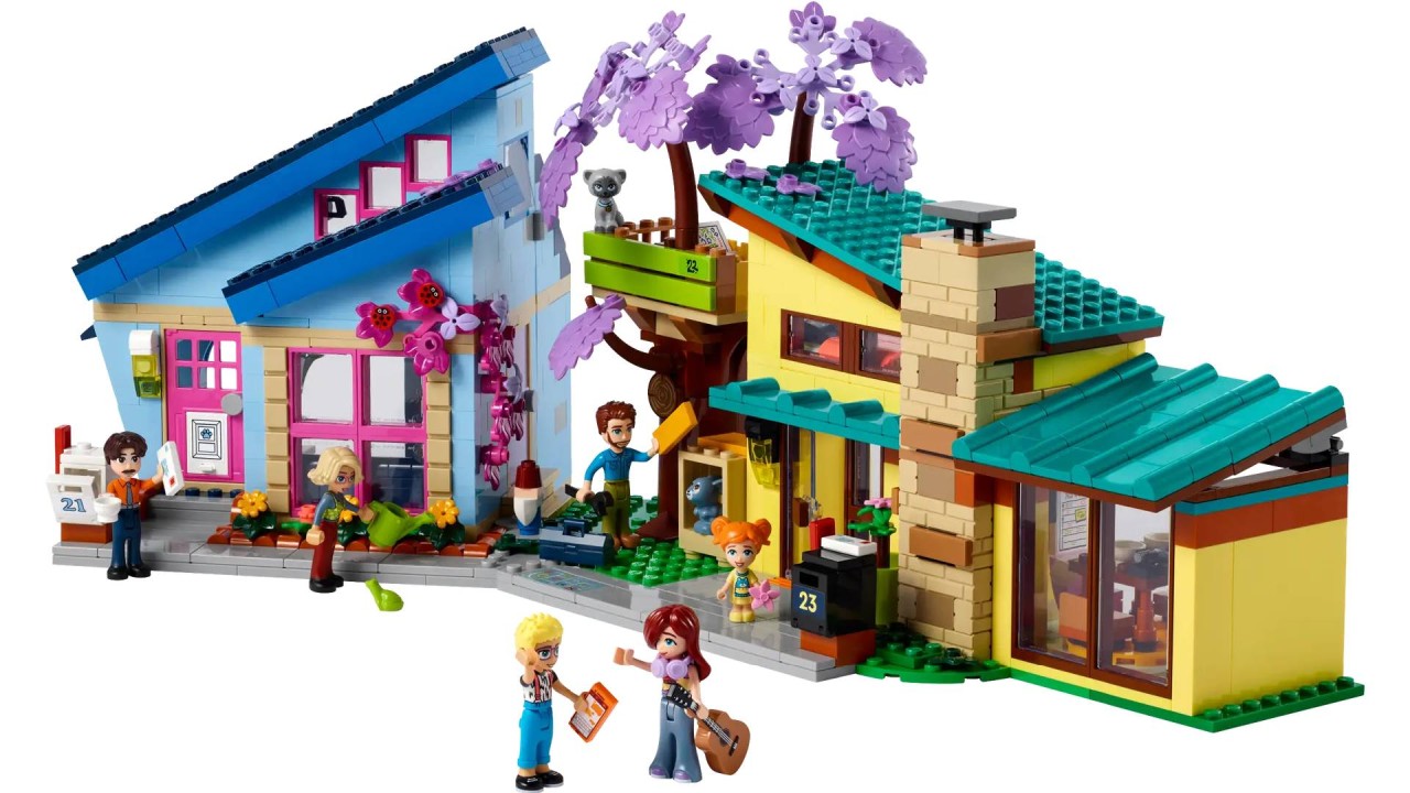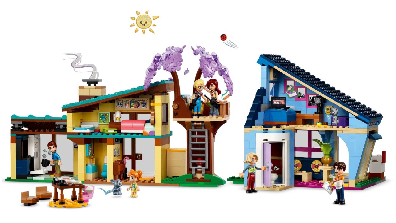 Această jucărie de construcție a casei de păpuși include casele cu două etaje ale lui Olly și Paisley, plus casa din copac care se află între ele.