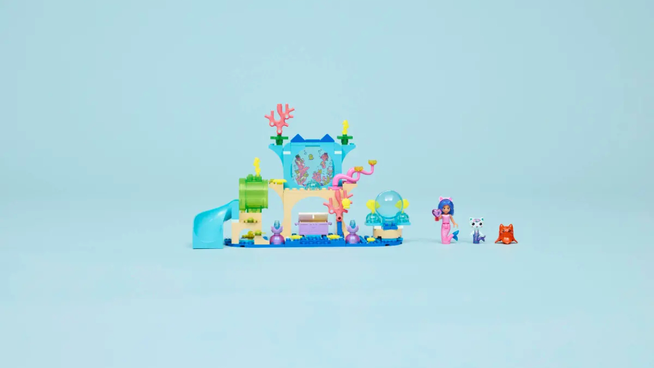Acest set de joacă LEGO Gabby's Dollhouse este plin de caracteristici vibrante și personaje familiare, inclusiv o minidoll Gabby în costumul ei de sirenă, și figurinele MerCat și Jellyfish.
