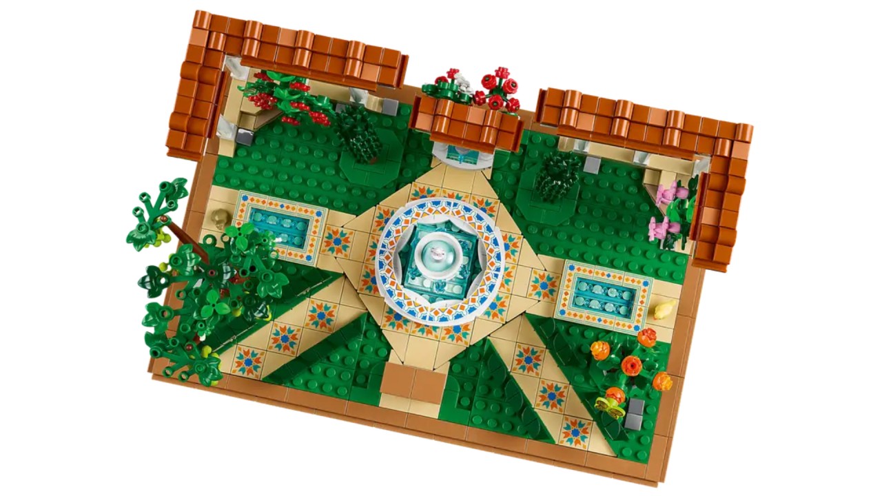 Modelul final include o fântână funcțională, cu apă curgătoare reprezentată de piese LEGO, plante detaliate, flori și decoruri care imită un peisaj de grădină perfect pentru relaxare.