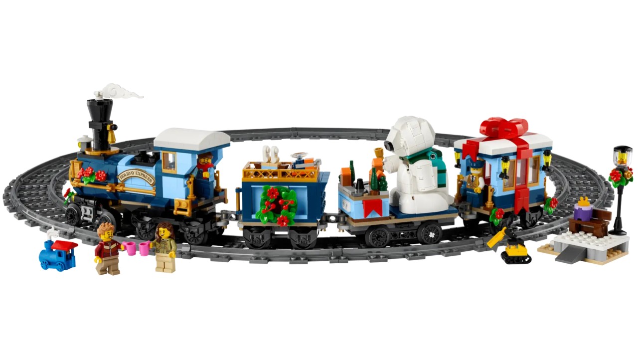 Setul de trenuleț LEGO® Icons Holiday Express Train a sosit. Construiește o locomotivă cu un coș de fum care se balansează, un vagon de cărbune, un vagon plat care transportă un urs polar care sună la clopot și un vagon de capăt cu interior mobilat.