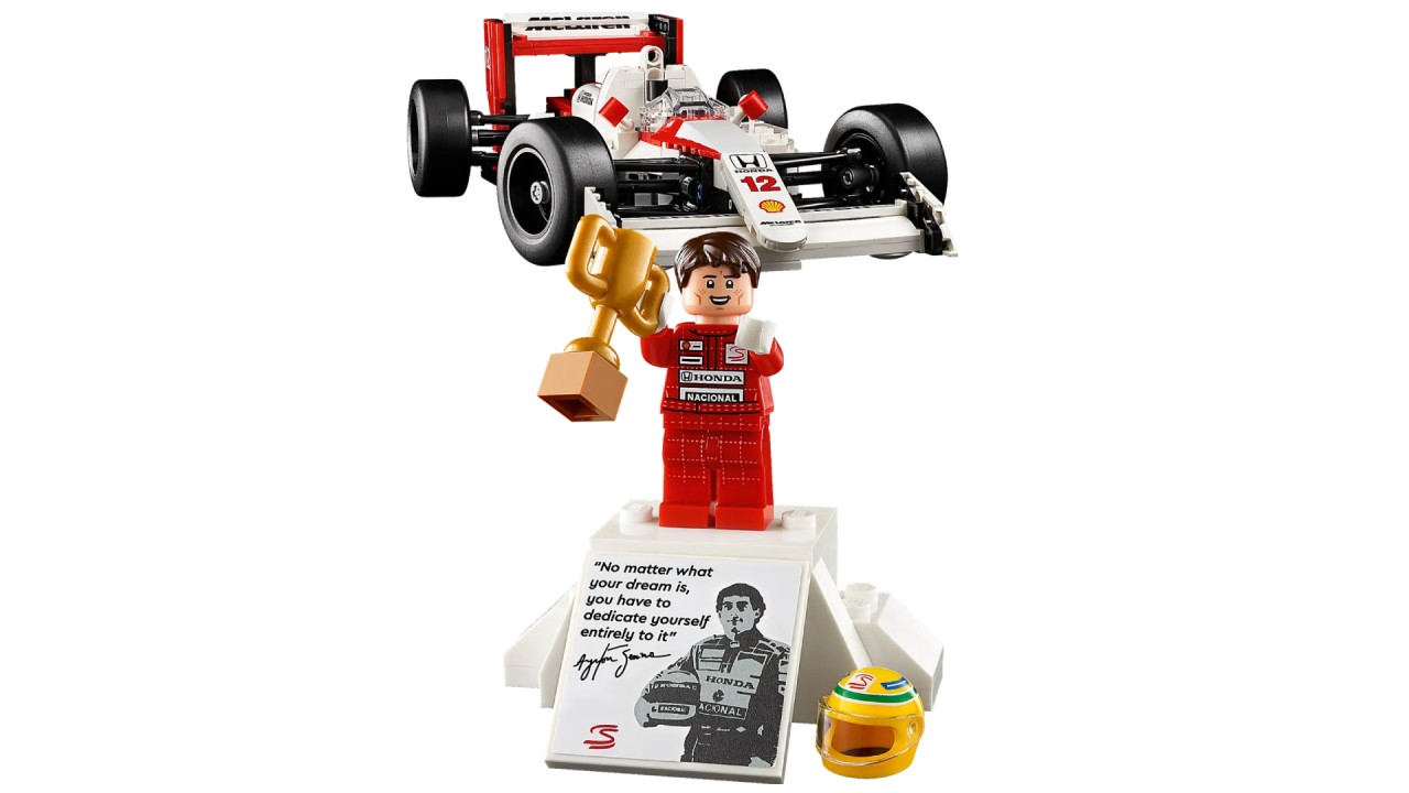 This set also includes a displayable Ayrton Senna minifigure. The Ayrton Senna minifigure comes with a podium-style display stand and a plaque with an iconic Ayrton Senna quote and photo.