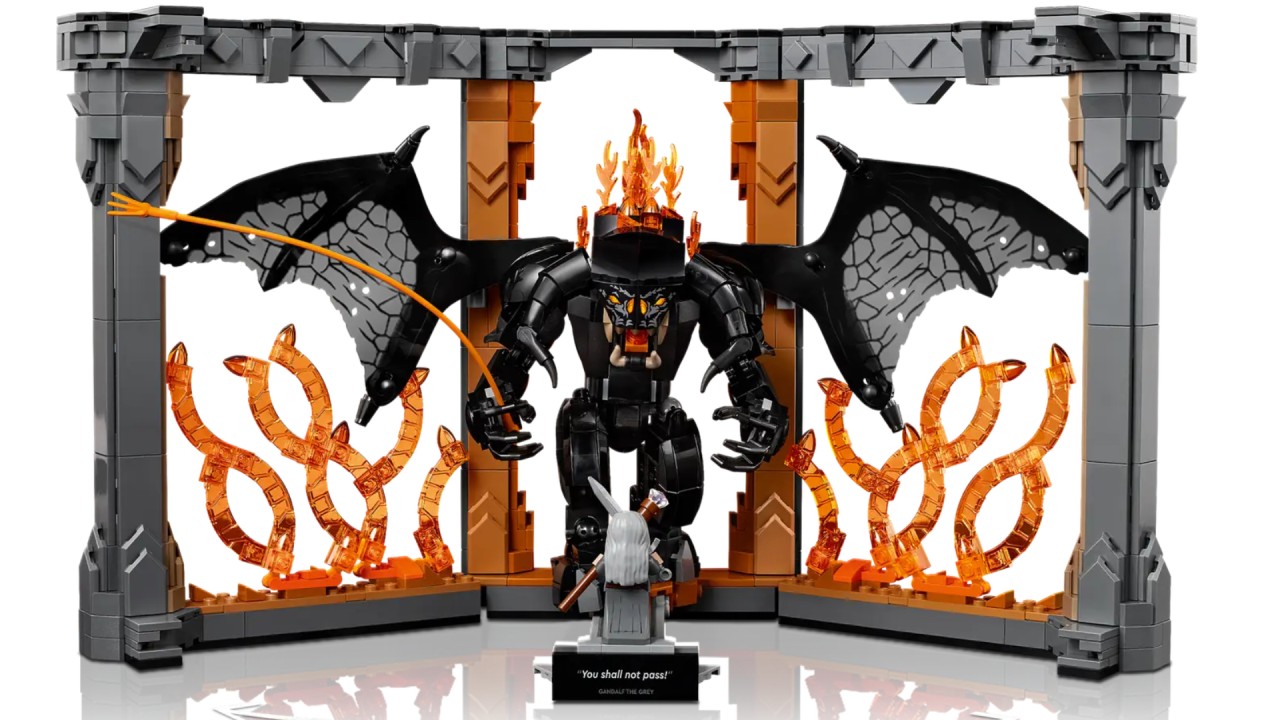 Both characters are detachable, and the minifigura Gandalf has a staff and a sword, while the Balrog figure handles a fiery whip and has limbs and posable wings for a dynamic exposure.
