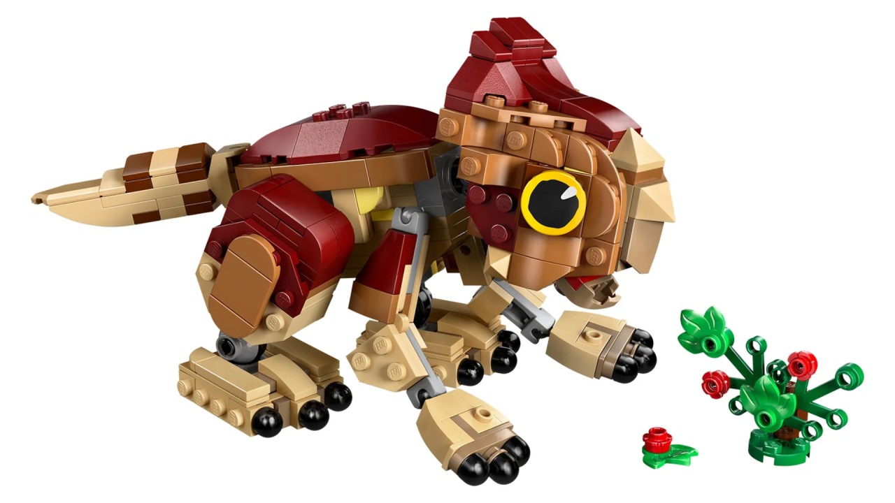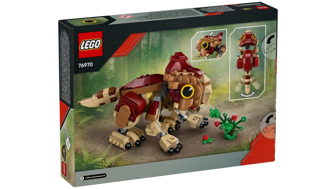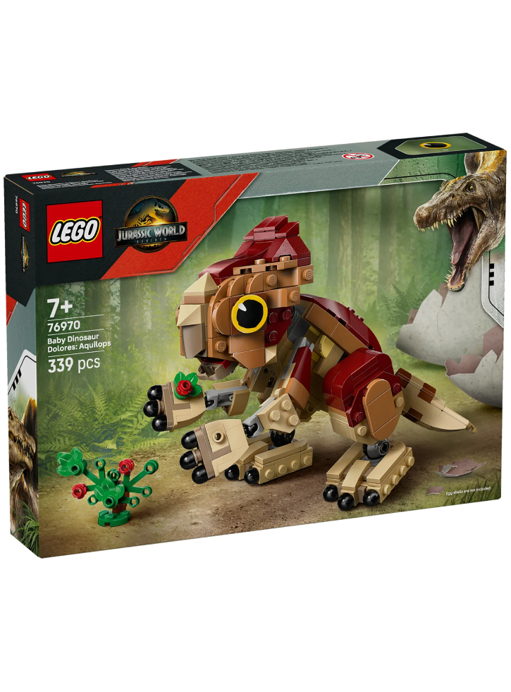 Acest set de construcție pentru joacă și expunere conține o figurină dinozaur Baby Aquilops construită din cărămidă pentru copii și o plantă construibilă cu flori.