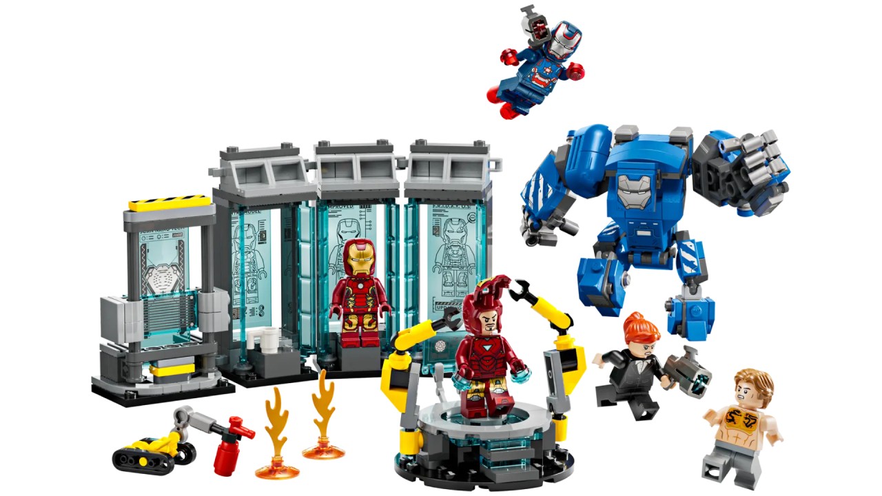 The buildable LEGO Marvel toy contains 3 armor capsules and 3 minifigurins of Iron Man: MK1, MK43 and MK6.