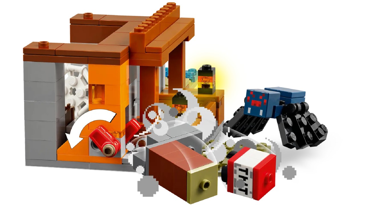 Located in the game savanna biom, this set of LEGO Minecraft toys presents a mine with a controlled lever function that takes a piece of land to reveal precious ore.