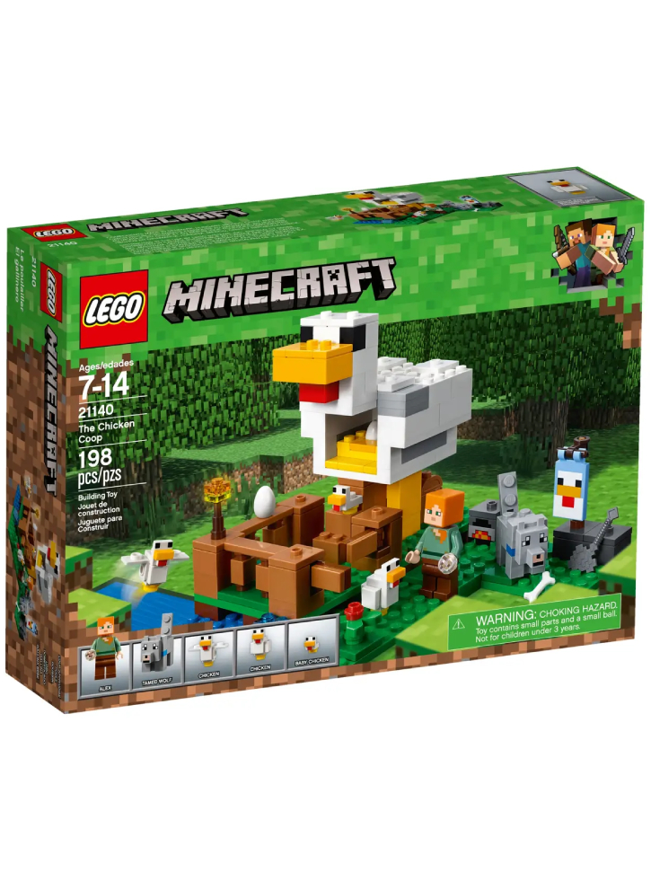 Setul include o minifigurină LEGO Minecraft Alex, plus figurine de pui și lup îmblânzit și 2 figurine de pui, un banner decorativ pentru pui, un țarc pentru pui cu poartă cu deschidere, un cuptor și o zonă cu apă și iarbă cu plante.
