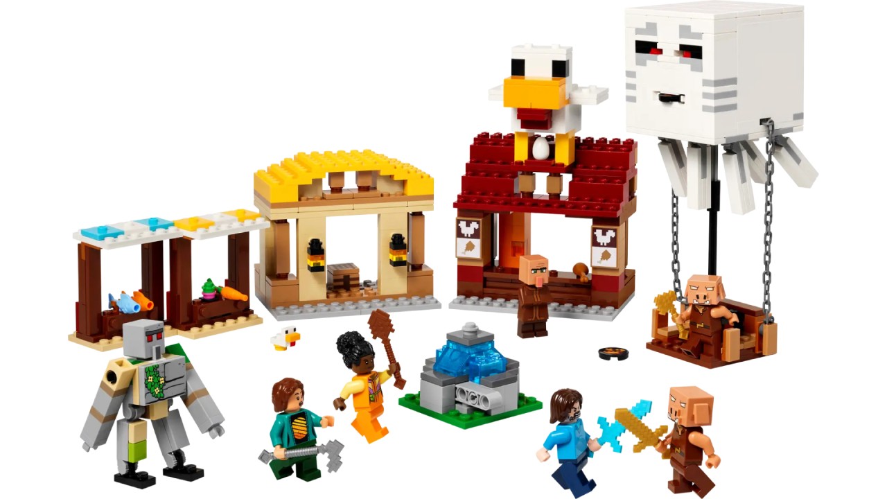 The set of The Ghast Balloon Village Attack is a creative set to build and play, inspired by a scene in the Minecraft movie.