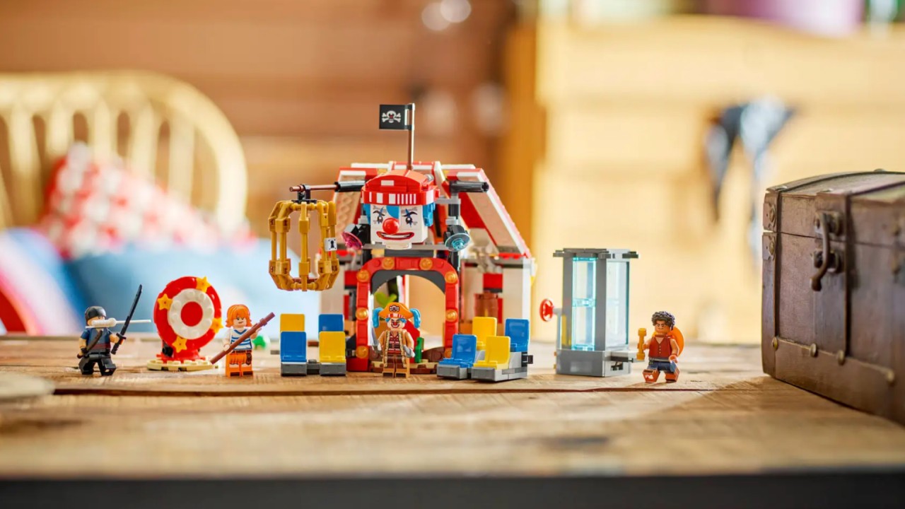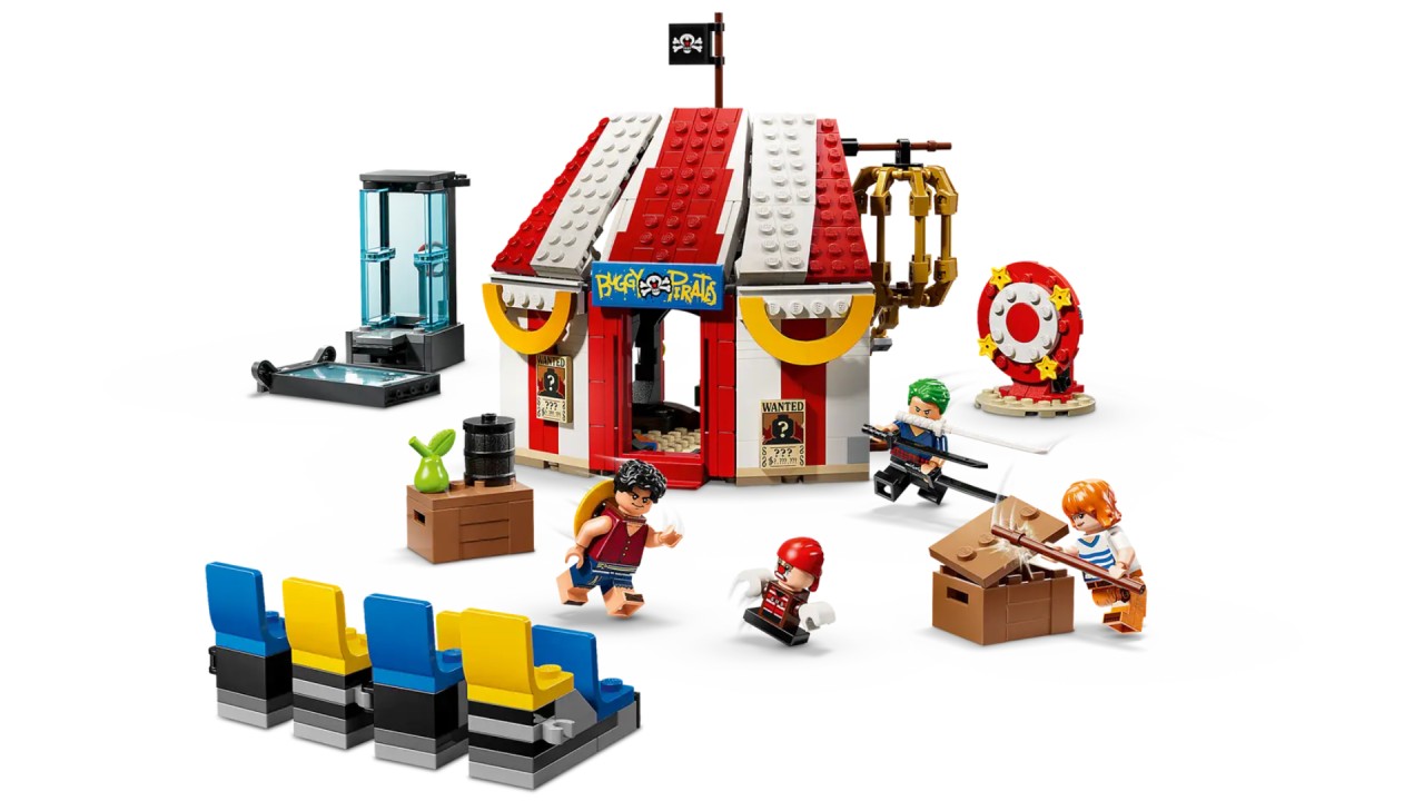 The set comes with Luffy, Zoro, Nami and pirate captain Buggy the Clown minifigures. The buildable tent can be turned to create a larger play area with removable sections for Buggy's seats and throne.