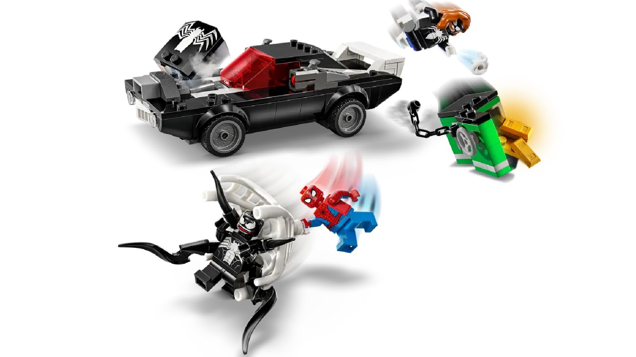 Jucăria construibilă Venom car vine cu 3 minifigurine LEGO Marvel: Spider-Man cu un web blaster, Venom cu 4 tentacule și Spider-Woman (Julia Carpenter) cu o pânză flexibilă care este suficient de mare pentru a prinde un răufăcător.