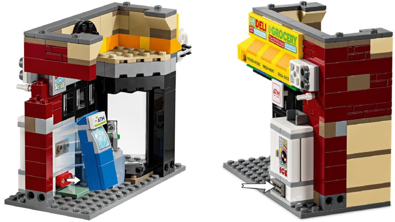 Magazinul de jucării construibil are o funcție de explozie a peretelui care permite îndepărtarea bancomatului, iar mașina de poliție se deschide pentru a permite plasarea a 2 minifigurine în interior.
