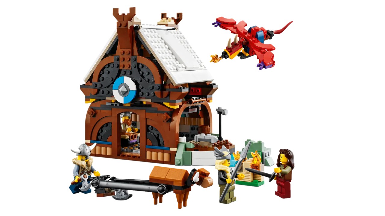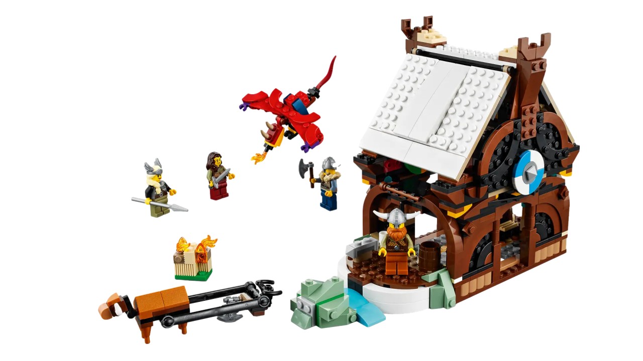 Jucăria de casă LEGO Viking are un acoperiș detașabil pentru a-și explora interiorul, plus o vacă din cărămidă și foc exterior cu un plug.