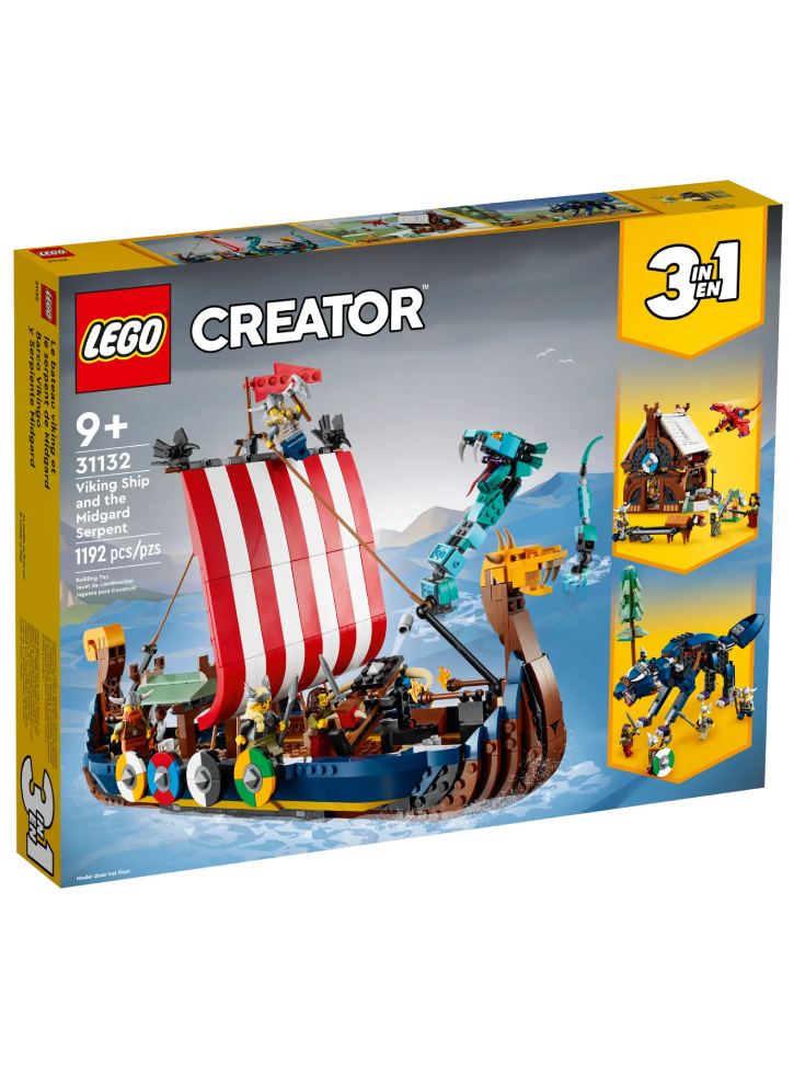 Modelul de navă vikingă este împodobit cu 8 scuturi colorate, o velă în dungi și 2 corbi din cărămidă, plus accesorii pentru a lupta cu șarpele.