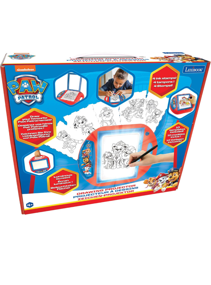 10 șabloane pentru a ghida copilul în timp ce desenează,1 stilou și 4 ștampile inspirate din universul Paw Patrol.