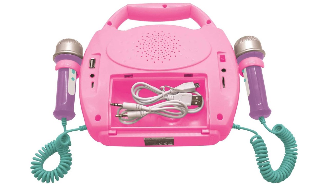 The portable karaoke player for kids that works wirelessly with Bluetooth-equipped devices. 2 microphones included to sing like a star.