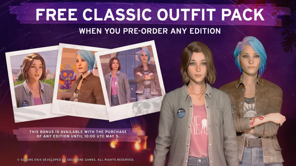 Precomandă orice ediție pentru a primi DLC-ul Max and Chloe Classic Outfits. Acest bonus este disponibil la achiziționarea oricărei ediții până pe 5 mai, ora 10:00 UTC.