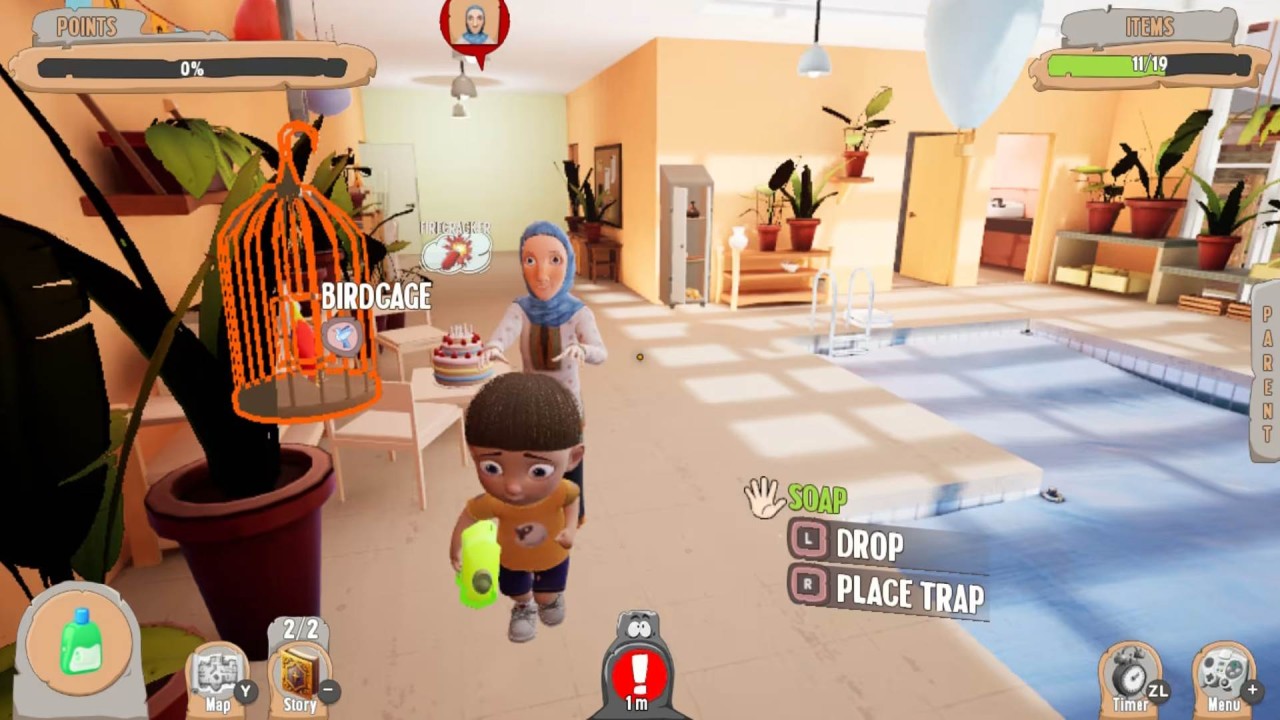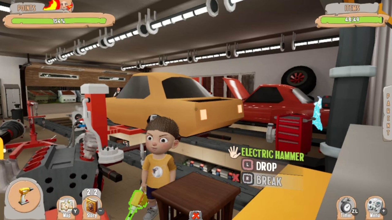 Folosește o varietate de obiecte de zi cu zi pentru a distrage atenția, a dezarma și a întârzia până când reușești să distrugi întreaga casă a părinților tăi adoptivi.