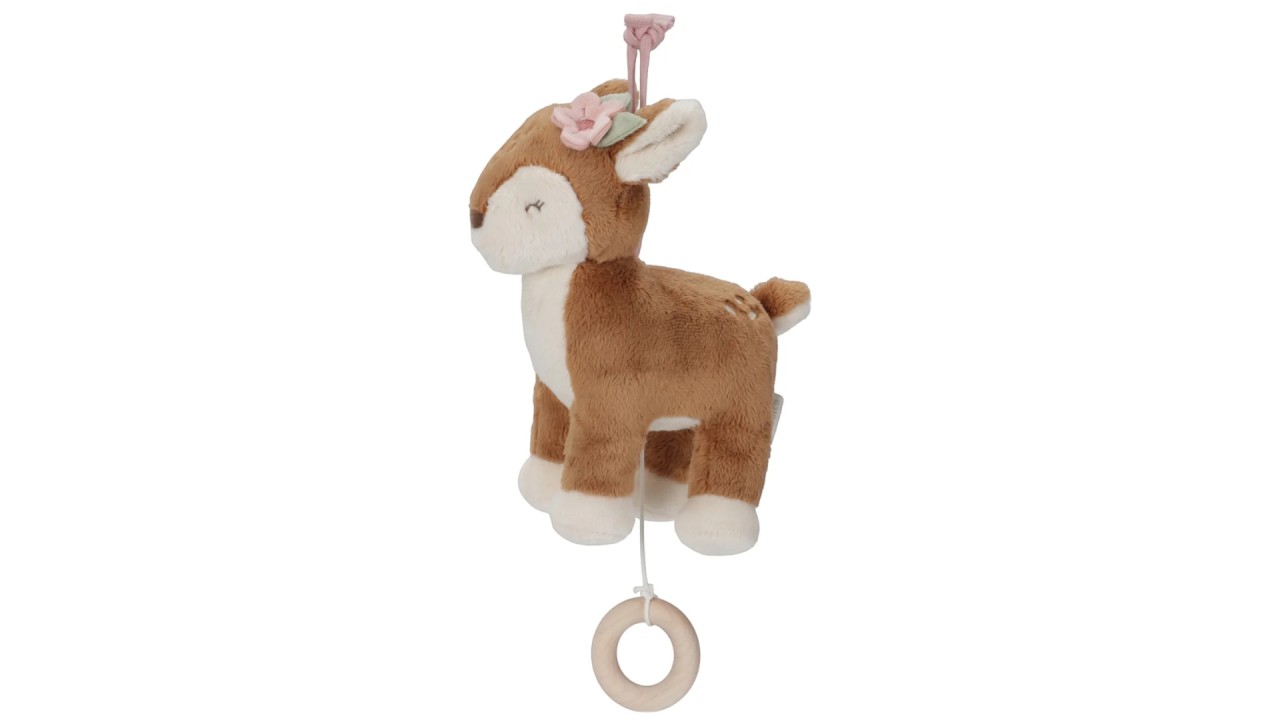Cutia muzicală este decorată cu un cerb drăguț și elemente din pădurea fermecată, incluzând flori și frunze, toate în culori pastelate și plăcute.