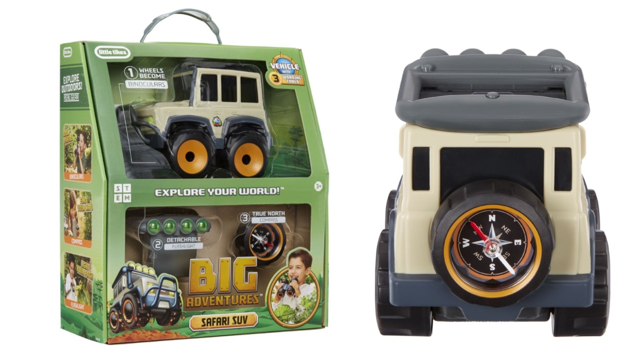 This Safari SUV truck includes three detachable tools: binoculars, flashlight and compass.