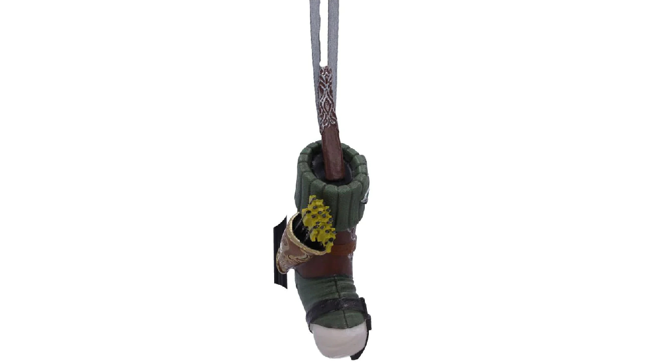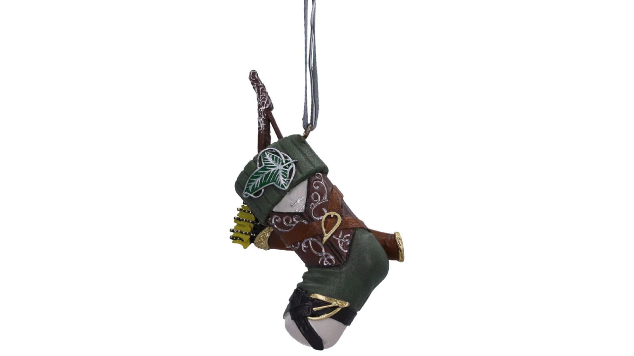 Inspirat de mantia verde mușchiuță și de tunica cu model a lui Legolas, acest ornament suspendat prezintă frunza instantaneu recognoscibilă din Lorien, alături de arcul său lung și săgețile care pot fi văzute ieșind din ciorap.