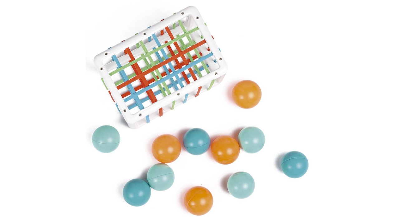 Cele 4 bile portocalii sunt ușoare și flexibile, dar durabile. Cele 8 bile albastre, din plastic dur, scot un mic sunet de zornăit care stârnește curiozitatea copiilor.