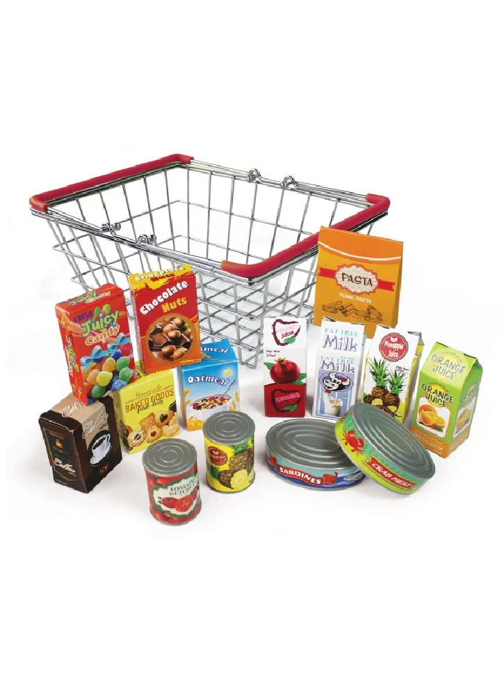The set includes a sturdy supermarket-like metal basket filled with miniature food products made from quality materials.