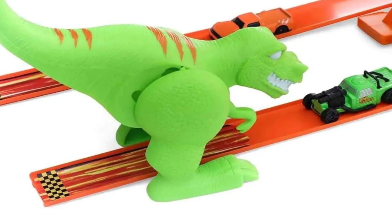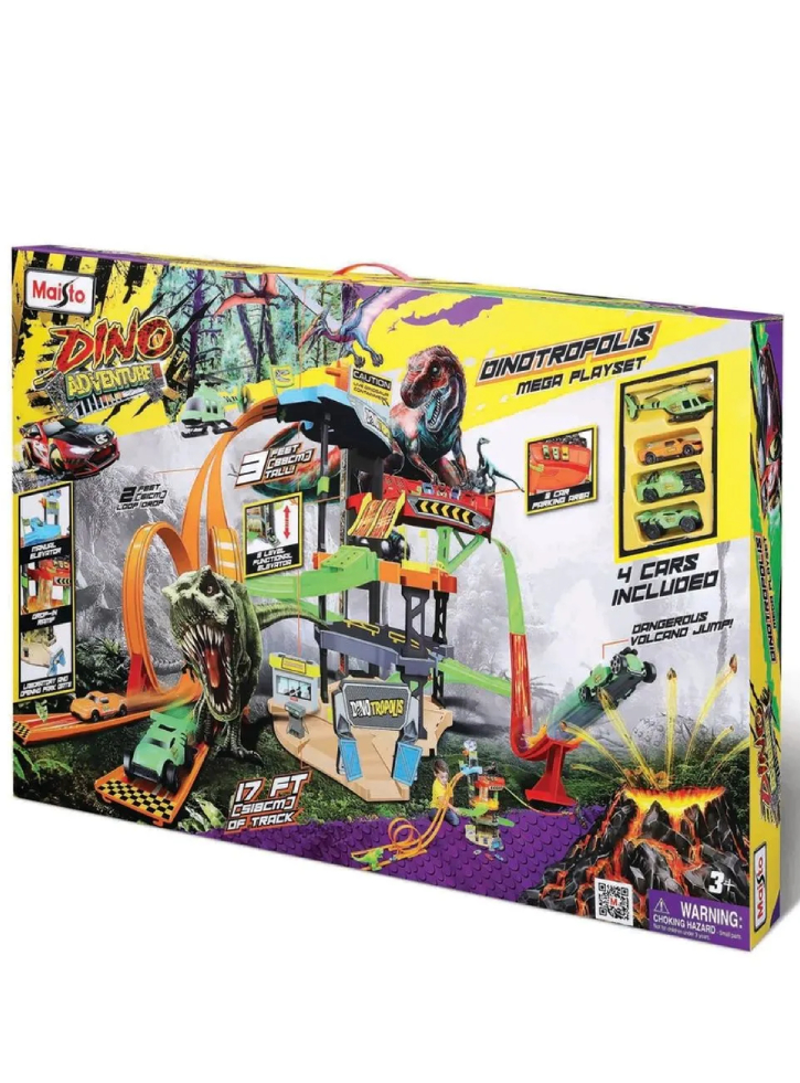 Acest playset Maisto Dinotropolis este un teren de joacă extins, dedicat micilor pasionați de mașini și aventuri.