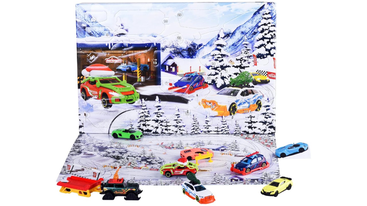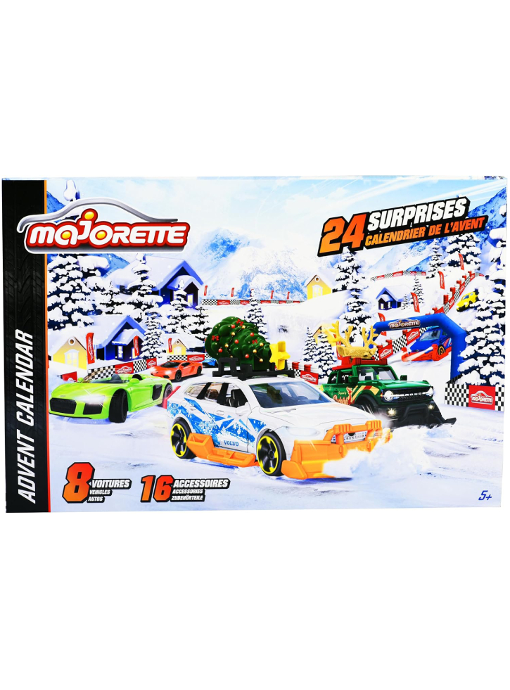 Calendarul de advent Majorette conține opt mașini și 16 bucăți de accesorii care pot fi folosite pentru a crea piste, a concura și a dezvolta mașinile pentru a deveni și mai inteligente.