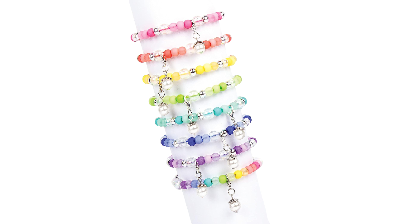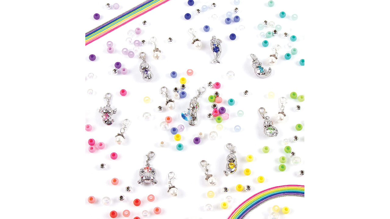 Fiecare kit conține, de asemenea, mărgele colorate, perle, 1 cordon pentru brățară și 1 cordon pentru colier. Fetele își pot păstra toate consumabilele pentru confecționarea bijuteriilor organizate cu ajutorul cutiei de bibelouri cu încuietoare din scoică!