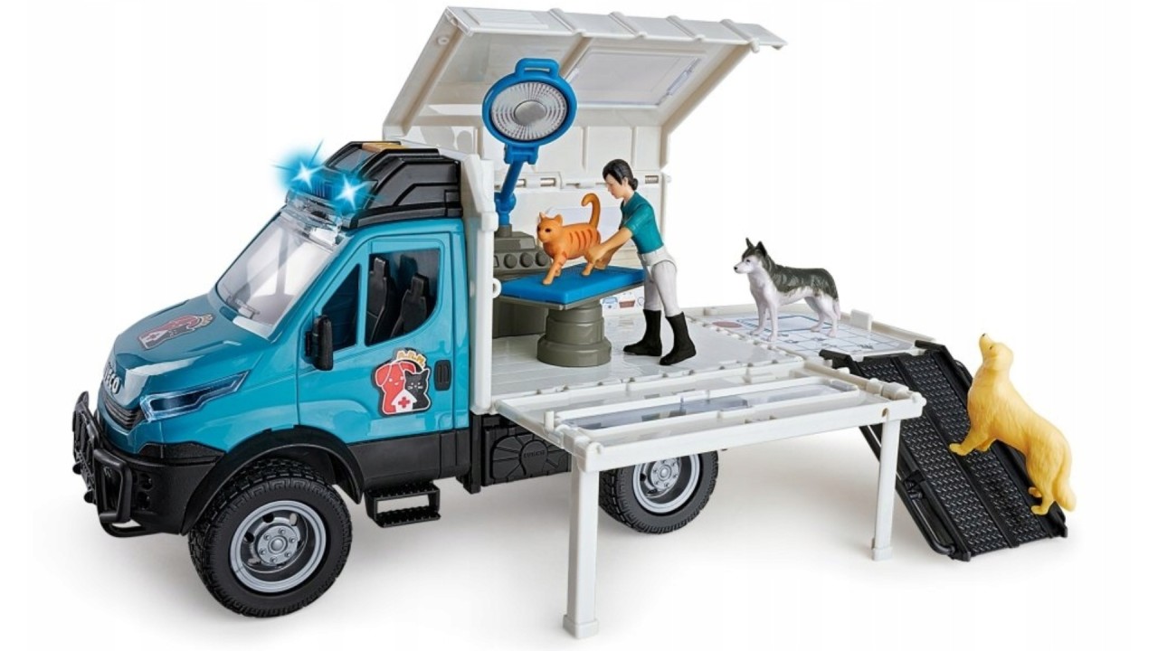 Efectele de lumină și sunet fac experiența și mai realistă. Cu acest camion, veterinarul poate fi la fața locului în cel mai scurt timp. Pe lângă figurina veterinară de jucărie, setul vine și cu doi câini și o pisică.