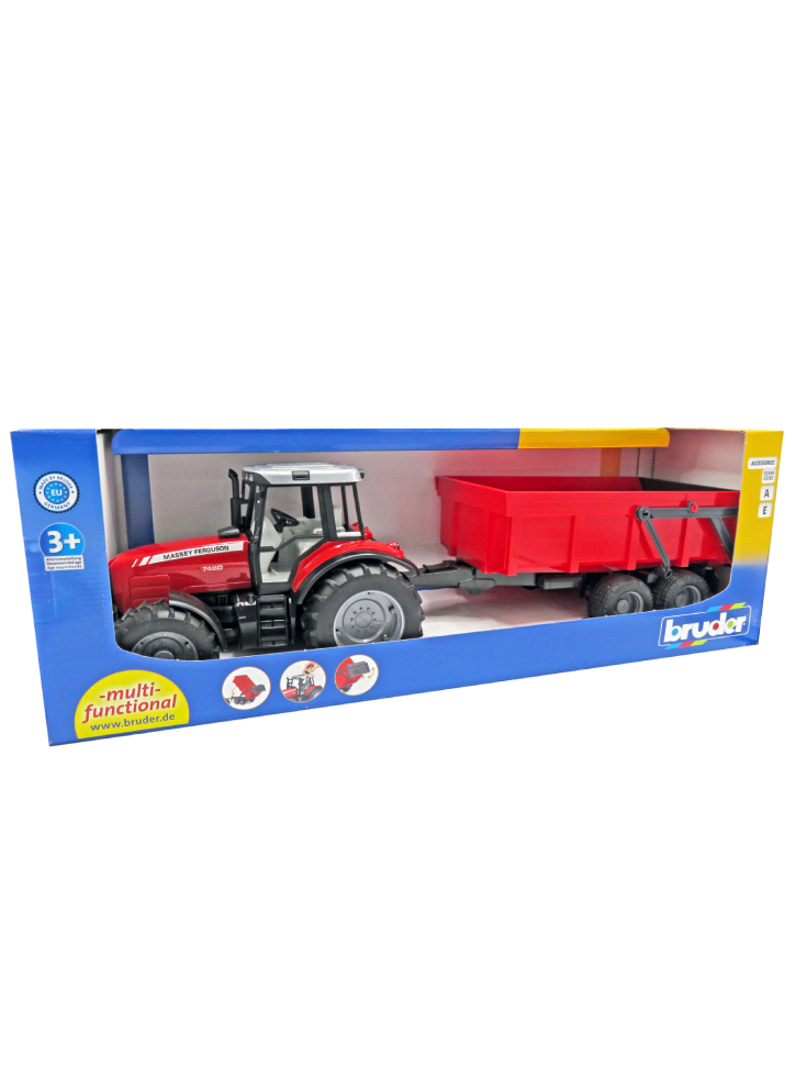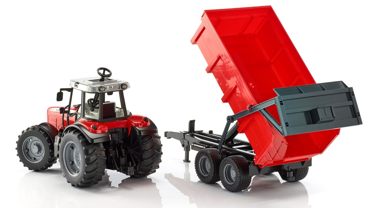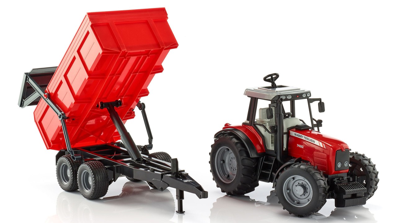 Tractorul Massey Ferguson 7480 cu remorca basculanta va fi jucaria preferata a copiilor care isi imagineaza ca lucreaza intr-o ferma.