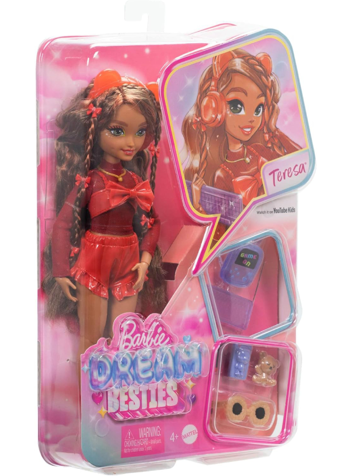 Păpușa Teresa are părul lung șaten, cu agrafe de păr cu fundiță roșie, pentru a-și pune în valoare personalitatea.