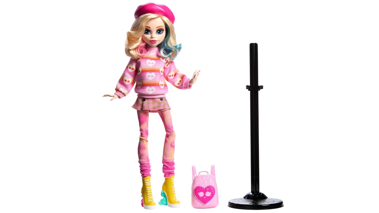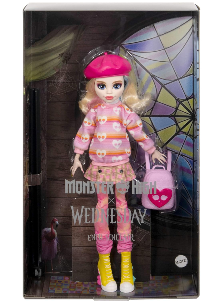 Inspirată de stilul luminos și colorat al personajului său, această păpușă de colecție Enid Sinclair arată iclawnic într-un look complet roz, cu o beretă și accesorii pentru rucsac.