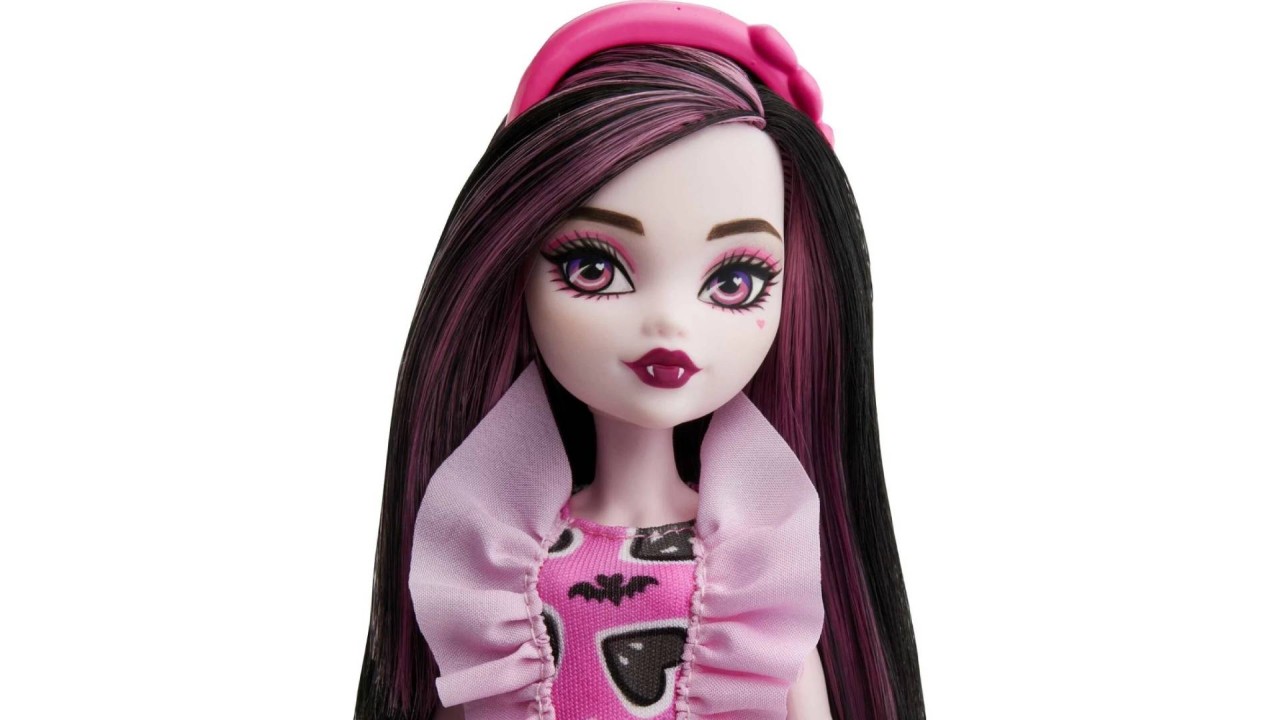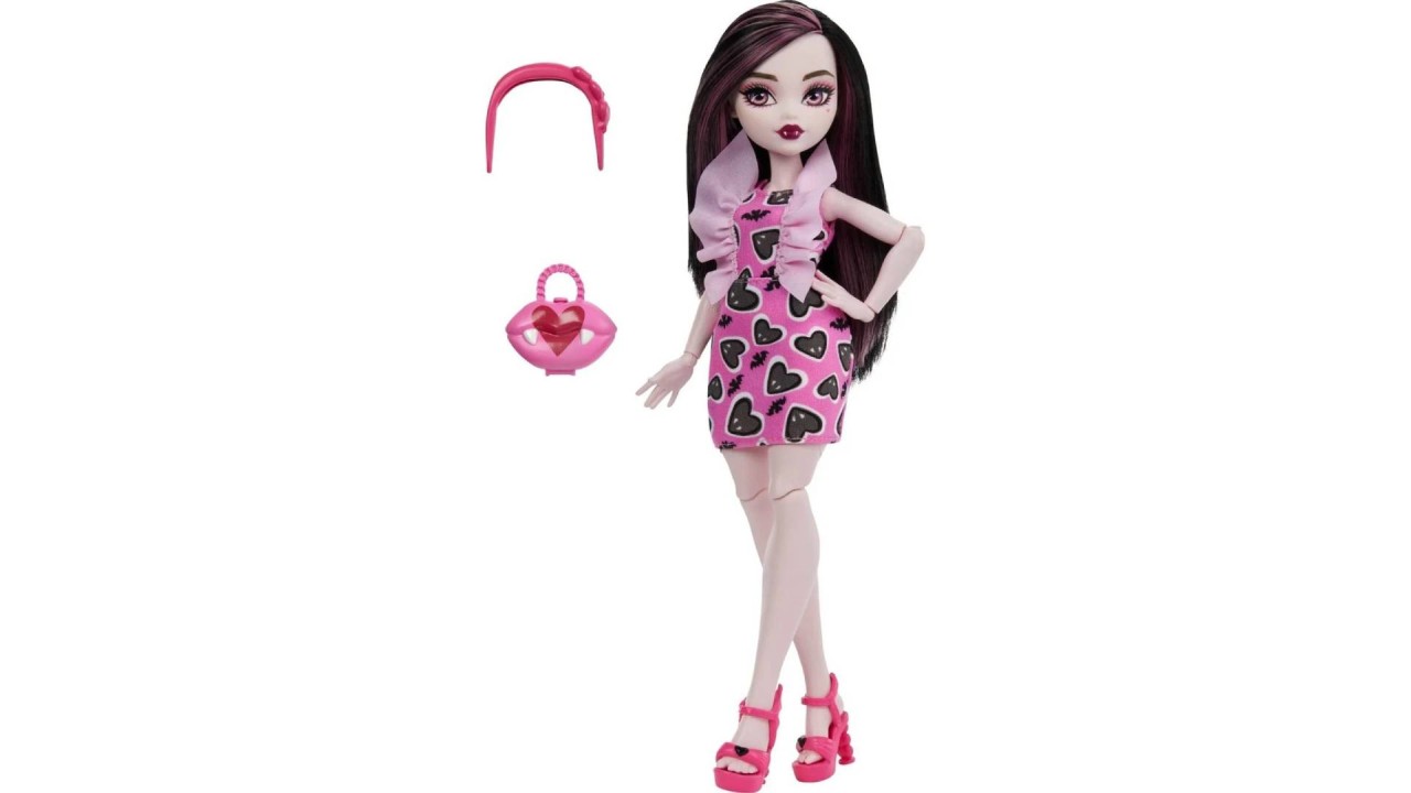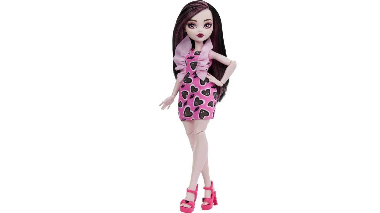 Draculaura is terribly cute, wearing a stylish dress with a heart print in her favorite color pink.