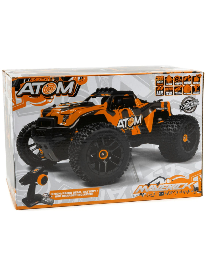 Maverick ATOM are o electronică complet nouă, cu caracteristici fantastice de top: o baterie Li-ion Maverick Element 1300mAh cu un încărcător USB, radio MTX-200 2.GHz și un receptor MSRS-200 2 în 1 rezistent la apă/controler de viteză și lumină.