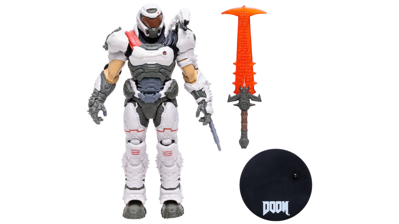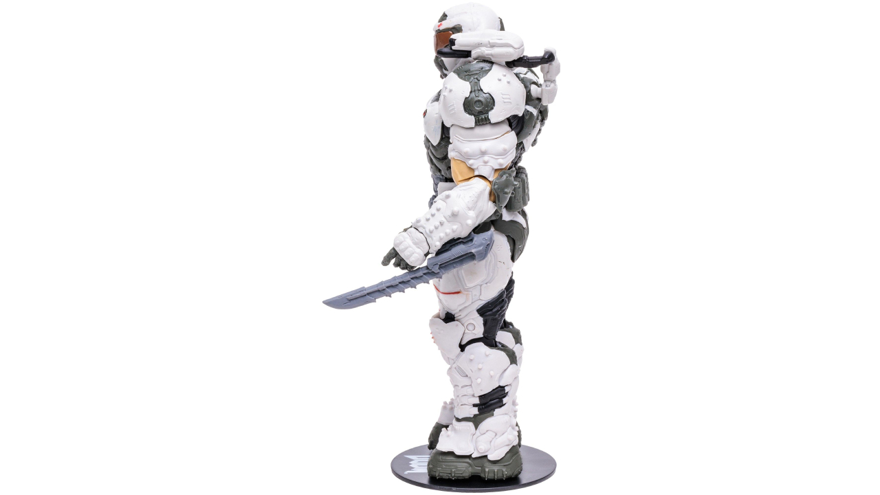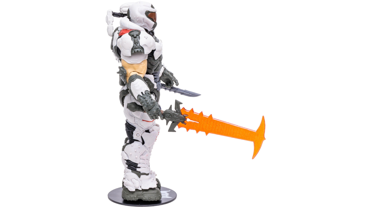 Iată-l pe puternicul Doom Slayer, purtând armura sa albă emblematică și gata să elimine hoarda demonică.