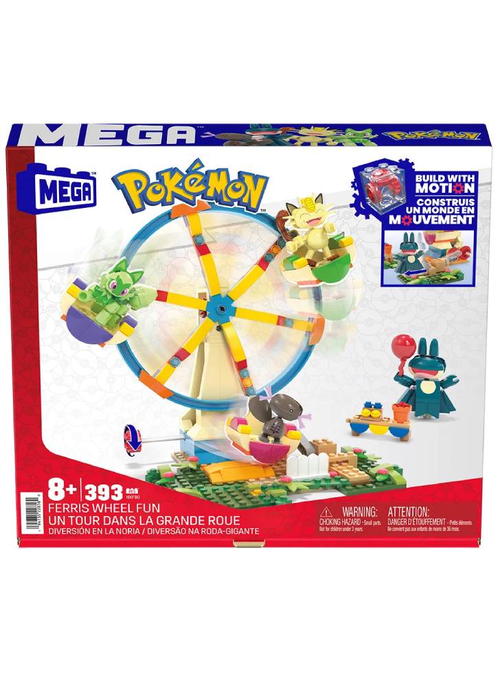 Rotește manivela pentru a activa mișcarea roții Ferris. Include 4 Pokémon construibili: Sprigatito, Meowth, Paldean Wooper și Munchlax.