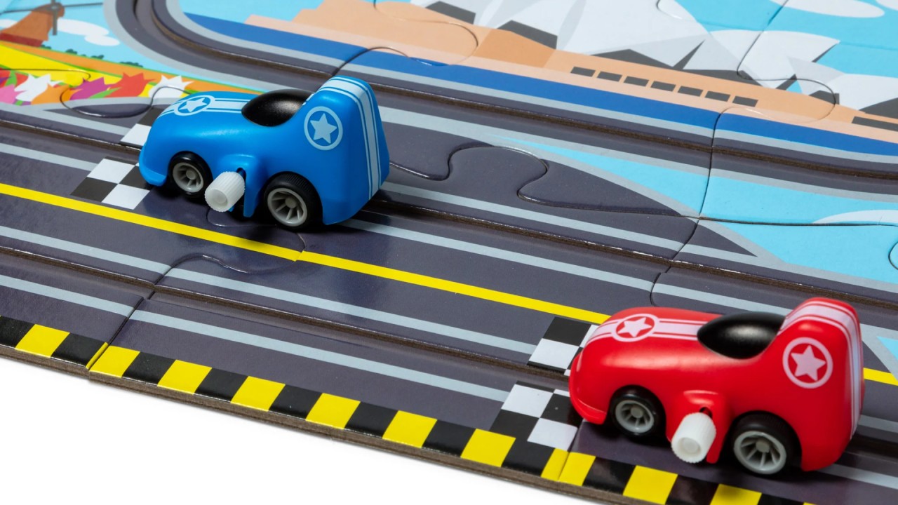 Asamblează 48 de piese din carton pentru a crea o pistă de curse care se desfășoară de-a lungul unora dintre cele mai faimoase repere din lume.