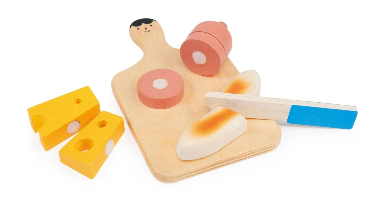 Acest set fermecător prezintă o selecție de produse alimentare din lemn și o placă de tocat cu o față zâmbitoare, oferind o experiență distractivă și educațională pentru micii bucătari.