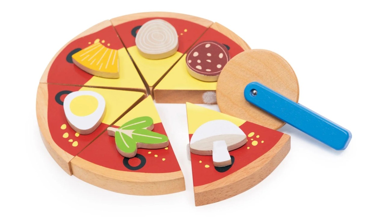Apoi e timpul să servim pizza de joacă! Iată o jucărie frumoasă de pizza din lemn cu 6 părți care pot fi decupate și asamblate cu velcro.
