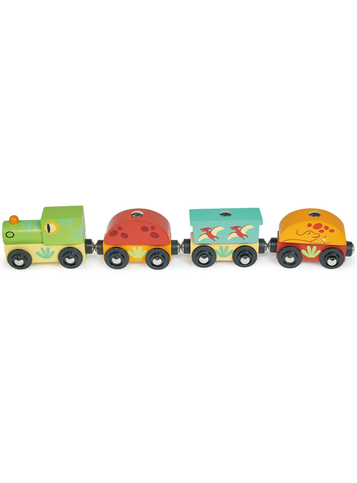 Decorate în culori strălucitoare, un motor de tren din lemn și trei vagoane, cu piese detașabile de dinozaur.