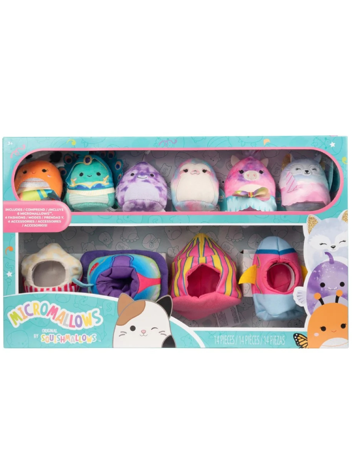 Acest set Micromallows vine cu 6 Squishmallows de 6 cm, 6 mode detașabile și 4 accesorii tematice pentru a construi mediul de carnaval potrivit.