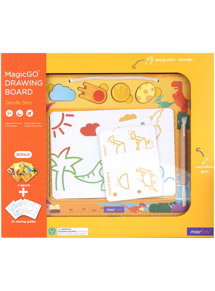 Doodle, write or draw with the attached pen and use four themed magnetic stamps to create your masterpieces.