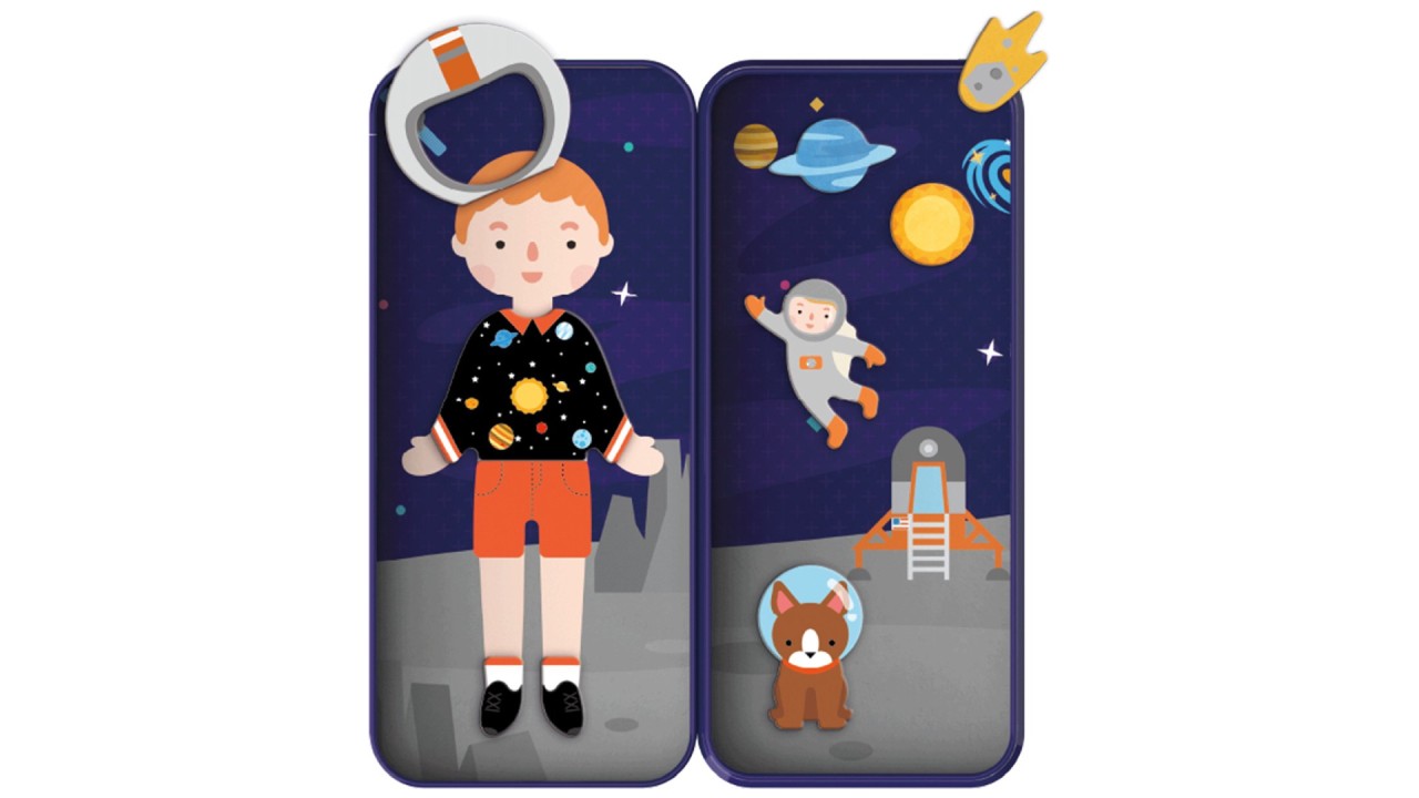 Each set contains two backgrounds, with a dress-up character on one side and one scene on the other, with more than 30 magnetic pieces.